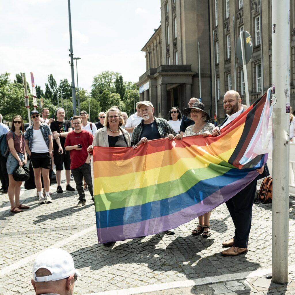 Dieses Jahr mit Angelika Schöttler, Elisabeth Ziemer, Matthias Steuckhardt und vielen Aktiven. Es wurde auch eine Progressive Pride Flag gehisst. Als SPD waren wir aus Bund, Bezirk und Land ebenfalls dabei, um dieses sichtbare Zeichen mit zu setzen. Sichtbarkeit, Akzeptanz und Sicherheit für die queere Community sind in diesen Wochen rund um Lesbisch-Schwules-Straßenfest mit vielen Symbolen und Aktionen besonders präsent. Aber an 365 Tagen im Jahr müssen sie in unserem Fokus stehen.